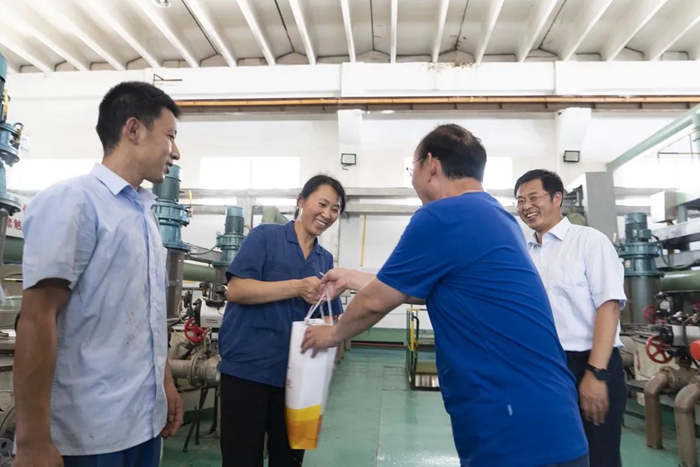 在慰問過程中,朱長(zhǎng)濤首先了解了集團(tuán)在高溫作業(yè)和高溫天氣作業(yè)勞動(dòng)保護(hù)工作的開展情況,并深入生產(chǎn)一線將“清涼”送到職工手中。