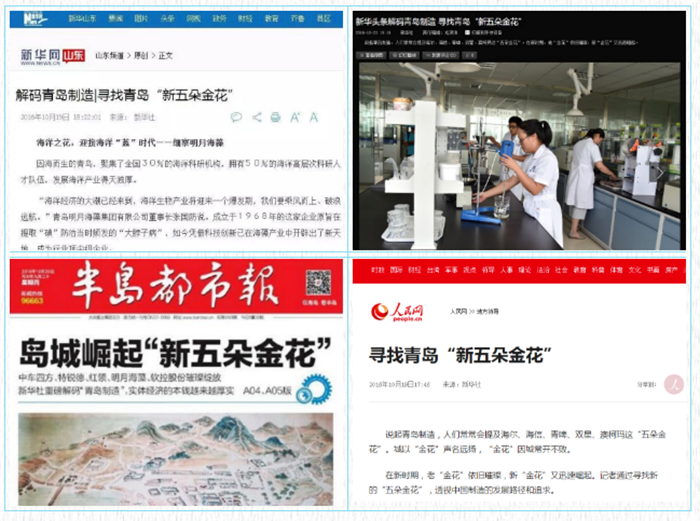 品牌成就城市,城市造就品牌。2016年8月,新華社“解碼青島”專題調研組抵青,圍繞“青島制造”的主題開展了集中調研,以“青島制造”為樣本,探尋中國制造之路。調研組先后到海爾、海信、青啤、雙星、澳柯瑪、明月海藻等22家知名企業進行實地調研采訪。新華社在調研之后,陸續推出了一系列“尋找青島‘新五朵金花’”的報道,其中,青島明月海藻集團因其鮮明的海洋品牌特色,被譽為青島“新五朵金花”之“海洋之花”。