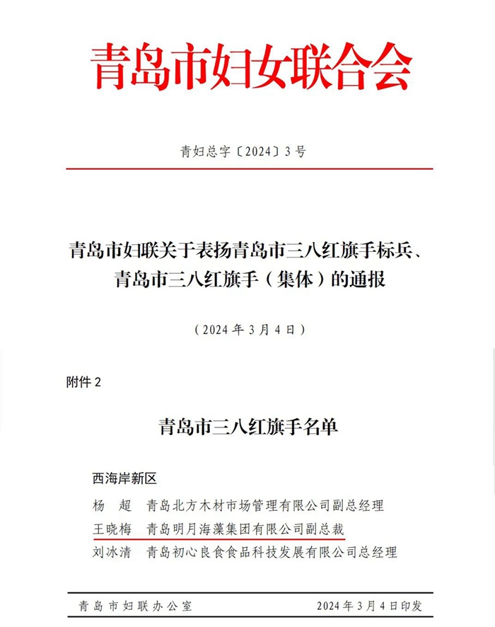 近日,青島市婦女聯合會發布《關于表揚青島市三八紅旗手標兵、青島市三八紅旗手(集體)的通報》,其中,青島明月海藻集團有限公司副總裁王曉梅同志獲評青島市三八紅旗手榮譽稱號。