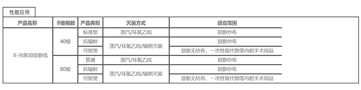 “潔靈絲”X-光醫用顯影線是通過采用先進的材料加工技術制備成型,由若干高分子長絲包覆后形成,其粗細度可根據用戶需要進行調整。本公司生產的“X-光醫用顯影線”的性能及加工工藝嚴格按照歐盟標準,產品具有很高的柔軟性及很好的物理機械性能,各項指標達到國際先進水平,可以與棉紗線一起織造后制備X-光顯影紗布,也可以通過加熱或超聲波方法與各種醫用織物粘合。
